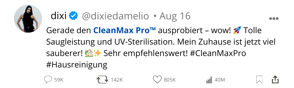 Ich habe den CleanMax Pro™ benutzt und war erstaunt! Er hat eine unglaubliche Menge an Staub und Schmutz aus meinen Teppichen und Betten entfernt. Fantastisch!